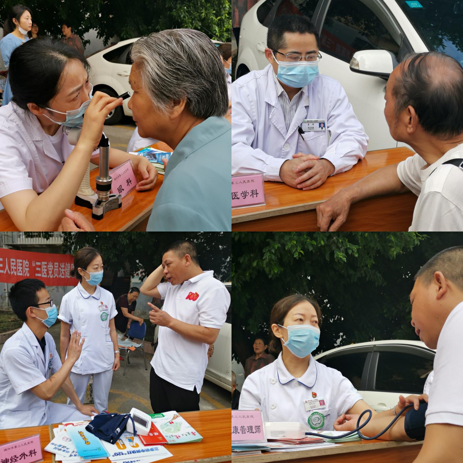 6月22日上午,我院举行了“三医党员送健康”活动,为开元路社区居民提供义诊咨询、健教宣传等服务。我院眼科许丹,全科医学科李峰,神经外科黎新慎,神经内科、脑心健康管理师蒲晓波等专家不畏酷暑,认真为群众进行现场诊治、测量血压;同时,积极宣传疾病预防措施,为群众讲解卫生保健知识,指导群众健康膳食搭配、合理用药等。事业发展部钟敏、汤倚马现场发放健康资料200余份。
