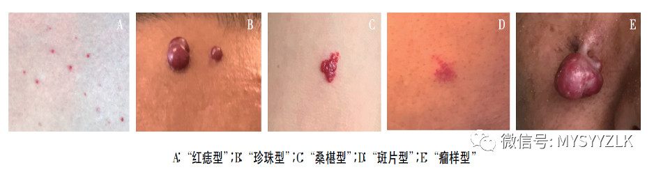 它分为“红痣型”、“珍珠型”、“桑椹型”、“斑片型”和“瘤样型”5 型,对糖皮质激素治疗不敏感,联合抗血管生成或化疗药物可明显减少其发生,停用后大多在1-2个月自行消退。